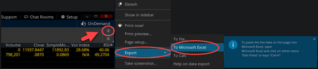 - Select Export > To Microsoft Excel. You will be then prompted to paste the live data into Excel.