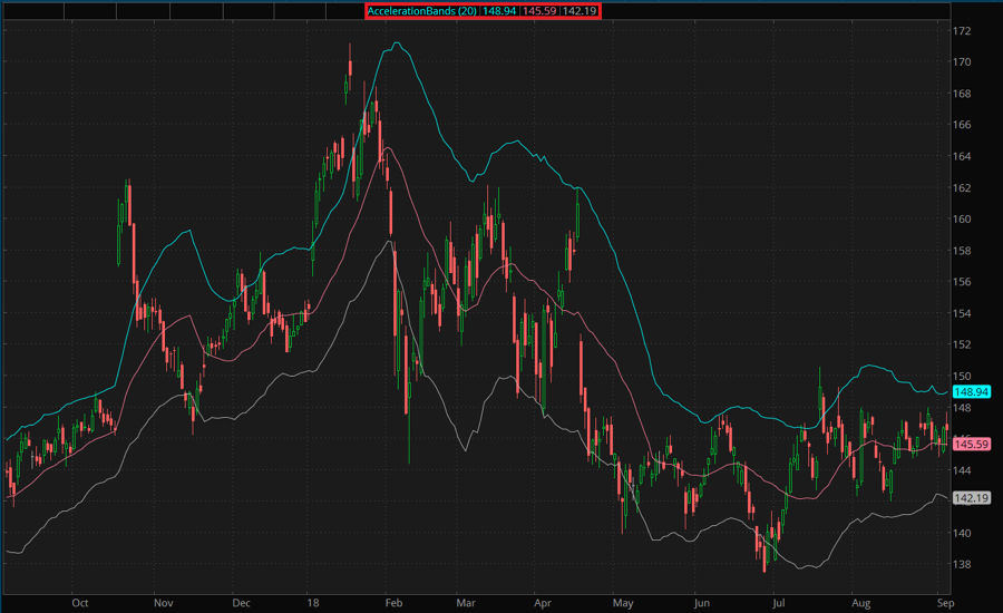 Acceleration Bands are based on the average trading range for each day. Acceleration Bands are plotted around a simple moving average as the midpoint, and the upper and lower bands are calculated based on high and low prices.