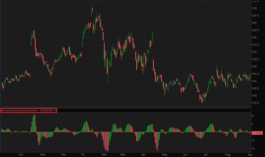 The Acceleration/Deceleration Oscillator study is used to evaluate the current momentum speed. It is calculated as the difference between Awesome Oscillator and its 5 period SMA. High positive values signify rapid price growth, low negative values suggest sharp decline. Values fluctuating around zero level indicate slow price changes.