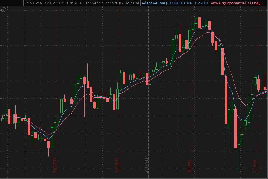 Like other moving averages, Adaptive EMA is trend-following. Using it along with the regular EMA of the same length, may give insight into current trend direction. Using two adaptive EMAs with different lengths may give important crossover signals.