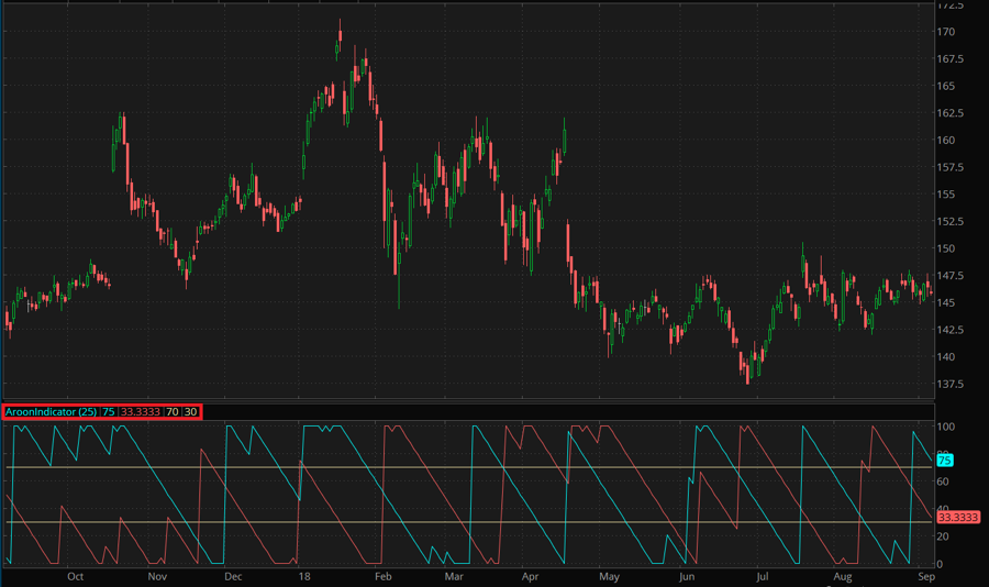 The Aroon Indicator is a study comprising two plots. The first one (Aroon Up) measures the number of periods since the most recent High reached within a specified time period. The other plot (Aroon Down) measures the number of periods since the most recent Low reached within the same period.