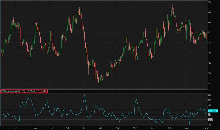 As the author suggests, trading signals might be derived based on the behavior of the divergence plot; these signals are used in the BBDivergence strategy after confirmation by other technical indicators. A buy signal is suggested when the divergence rises above the upper level (set by default at 20%) and then starts declining. Vice versa, it might be interpreted as a sell signal when having fallen below the bottom level (-20% by default), the divergence reverses its direction.