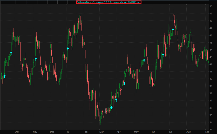 Plot displaying Bollinger Bands® crossovers. |