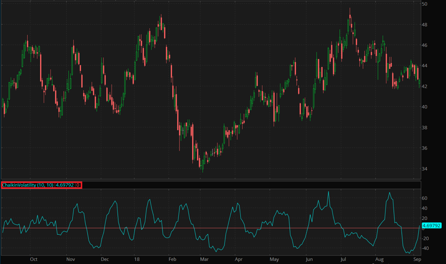 The Chaikin Volatility study is a technical indicator used to predict trend reversals based on volatility analysis. This indicator interprets volatility as expansion of the range between High and Low prices. The Chaikin Volatility indicator is calculated as the rate of change of the average trading range.