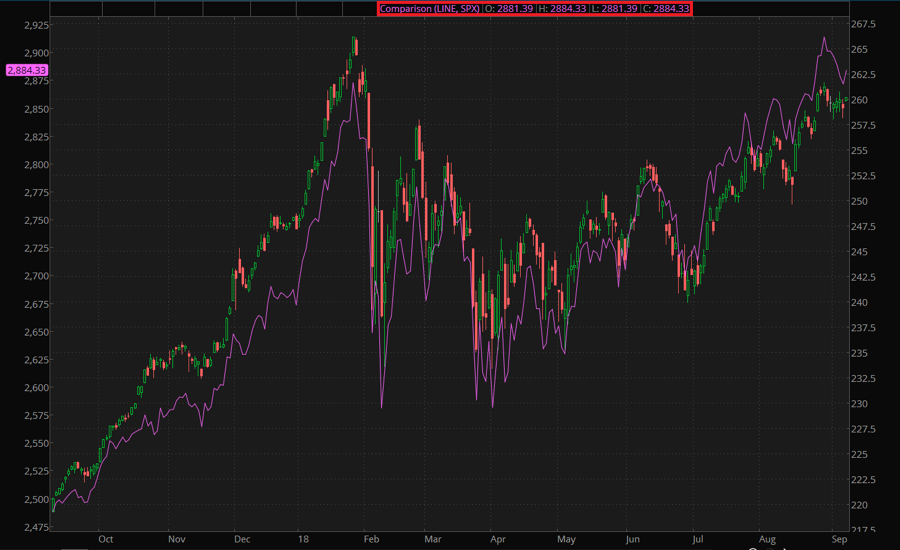 The Comparison study can be used for visual comparison of price action between two symbols: it complements current symbol's price plot with that of a different one. Consider using the Show Price as Percentage option so that the two plots will be displayed on the same scale.