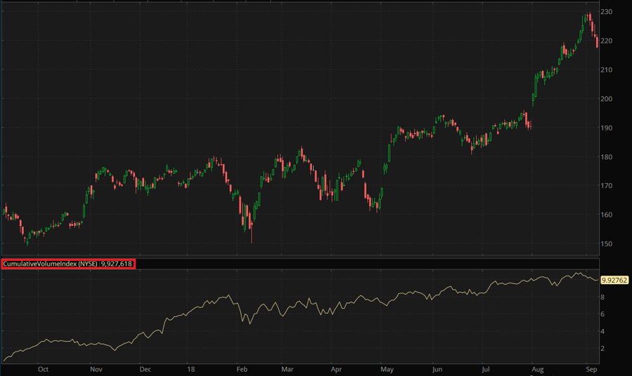 The Cumulative Volume Index is a study tracking the money flow in and out of the market based on market momentum. It is calculated as cumulative sum of differences between the volume of advancing stocks and that of declining stocks.