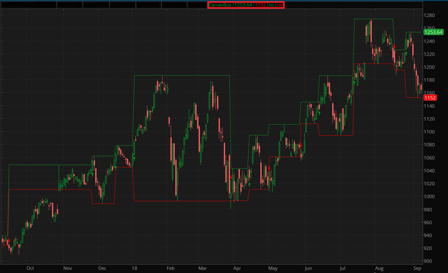 The Darvas Box study generates Buy and Sell signals based on crossovers of the price plot with two bands. These bands are plotted at High and Low price levels of the bar that is in a certain state. Five states are considered when calculating upper and lower band levels.