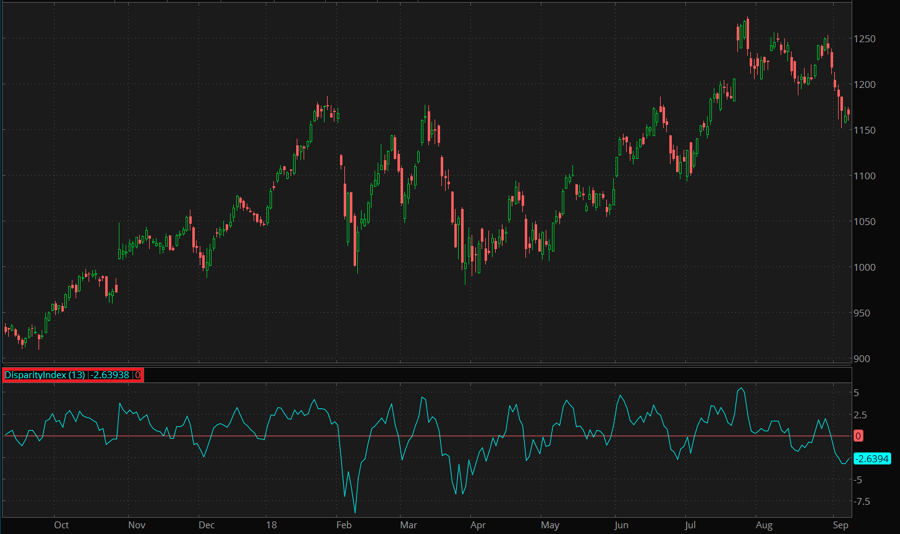 The Disparity Index is a study calculated as a relative difference between the recent close and its exponential moving average. The resulting value is displayed as a percentage.