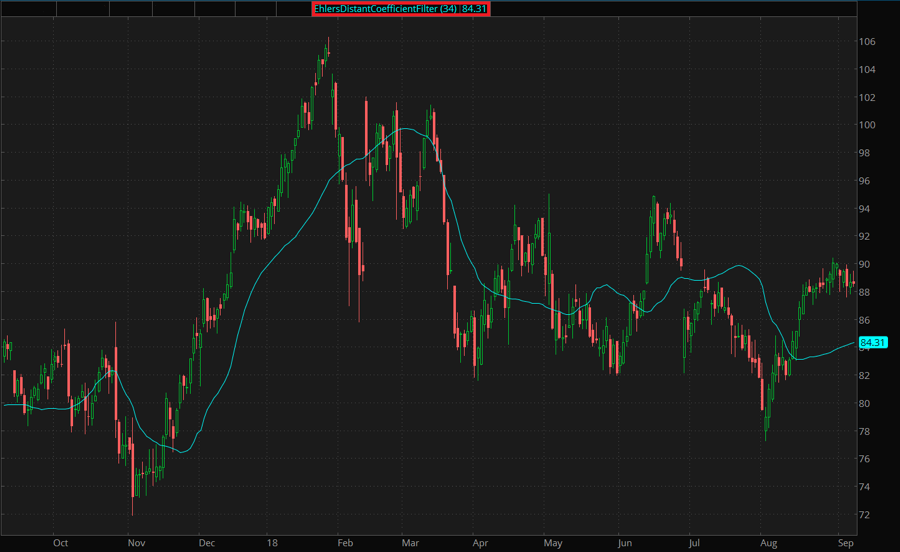 The Ehler's Distant Coefficient Filter is a non-linear filter that filters out non-stationary data. The filter can be considered a technique of finding weighted average of the median price data: its calculation mechanism assigns weights to the bars according to the median prices and recent price changes.