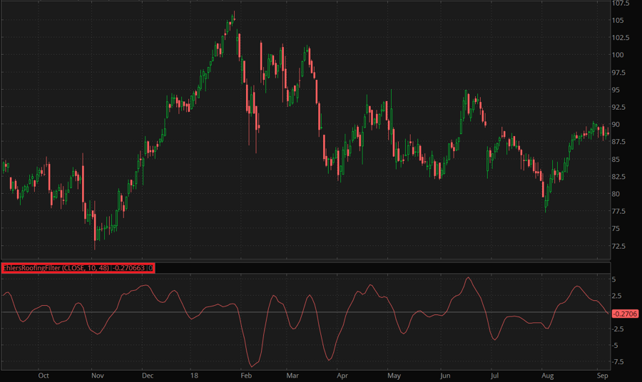 The Ehlers' Roofing Filter is an expansion on Ehlers Super Smoother Filter, both being smoothing techniques developed by John F. Ehlers, based on aerospace analog filters. This filter aims at reducing noise in price data, which appears to be stronger as the high-to-low price swings increase especially when chart is plotted for greater time intervals.
