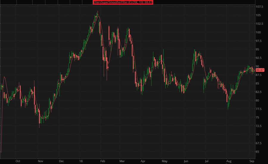 The Ehlers' Super Smoother Filter is a smoothing technique developed by John F. Ehlers, based on aerospace analog filters. This filter aims at reducing noise in price data, which appears to be stronger as the high-to-low price swings increase especially when chart is plotted for greater time intervals. In theory, this filter eliminates the noise completely, as opposed to moving averages, e.g., exponential (EMA) which only offers a modest attenuation effect.