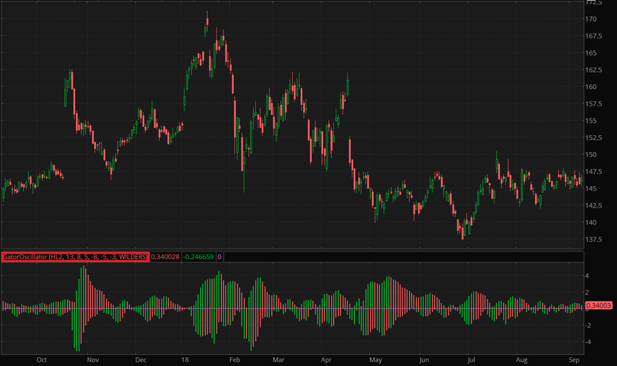 The Gator Oscillator comprises two histograms showing degree of convergence/divergence of Williams Alligator study plots. The upper histogram represents the difference between values of Jaw and Teeth plots, the lower histogram represents that of Teeth and Lips plots.