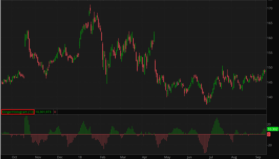 The Klinger Histogram study visualizes the difference between primary Klinger Oscillator value and its EMA.