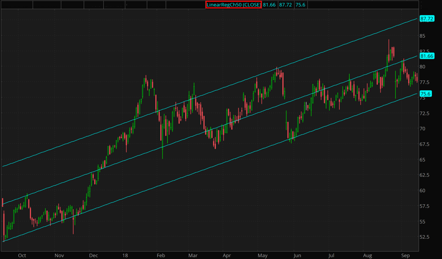 The Linear Regression Channel 50% study is similar to Linear Regression Channel 100% with the only difference that upper and lower lines are placed at a distance equal to half of that used in the latter study.