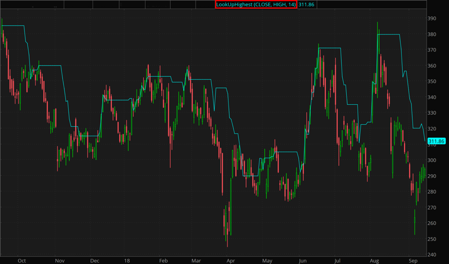 Basically, if this study uses its default parameters (look-up price is High, price returned is Close, and the length is 14), the study will return the Close price of the bar that has the highest High among the 14 bars.