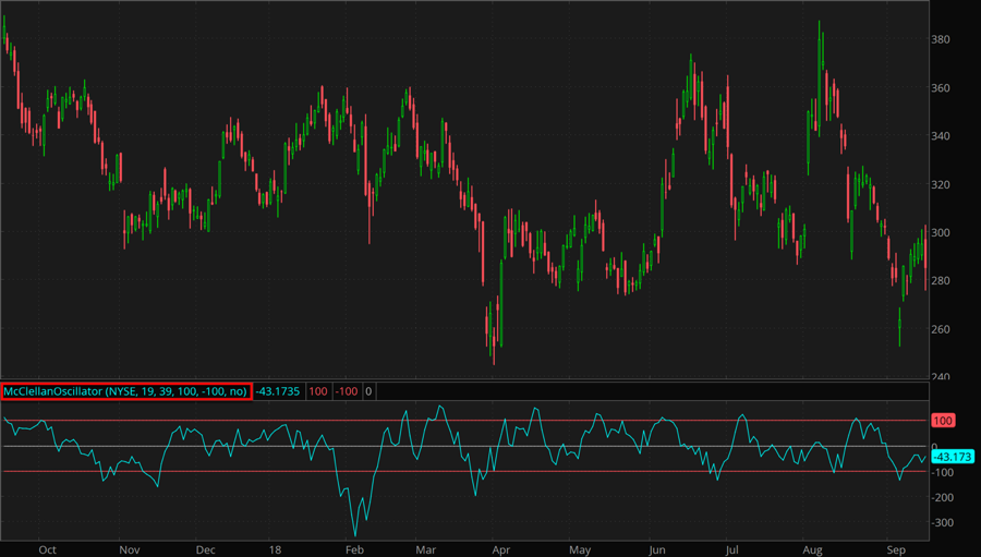 The McClellan Oscillator is a market breadth indicator based on the difference between the number of advancing and declining stocks on exchange.