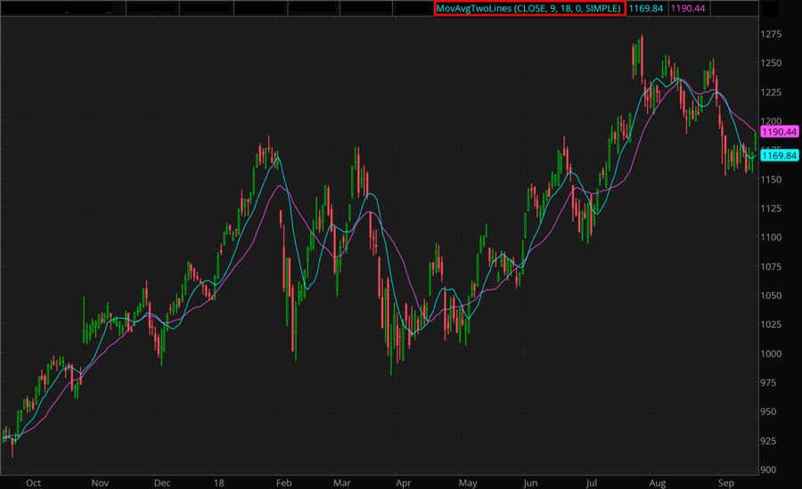 The Moving Average Two Lines study plots two moving averages of the same type but with different lengths. Any of the following types can be used: simple, exponential, weighted, Wilder's, or Hull.
