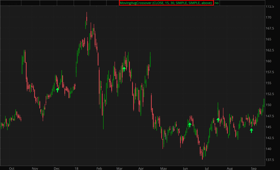 Moving Average Crossover is a study which helps you find crossovers of moving averages of different types and lengths. The following moving averages can be used: simple, exponential, weighted, Wilder's, or Hull.
