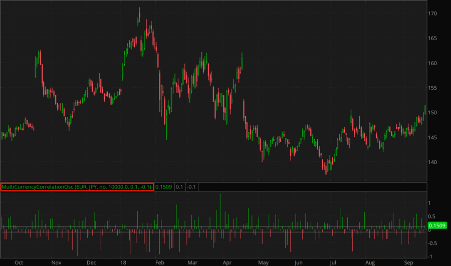 In order to use the Multi-Currency Correlation Oscillator properly, the following needs to be defined: whether the currency pairs are moving in the same direction or opposite directions. Pairs that move in the same direction can provide entry or exit signals when they have correlated moves. Conversely, for opposite-direction pairs, the signals might be looked for when the pairs move away from each other. When calculating correlation coefficient, the Multi-Currency Correlation Oscillator takes into account Open and Close prices of futures contracts corresponding to either currency in the pair.