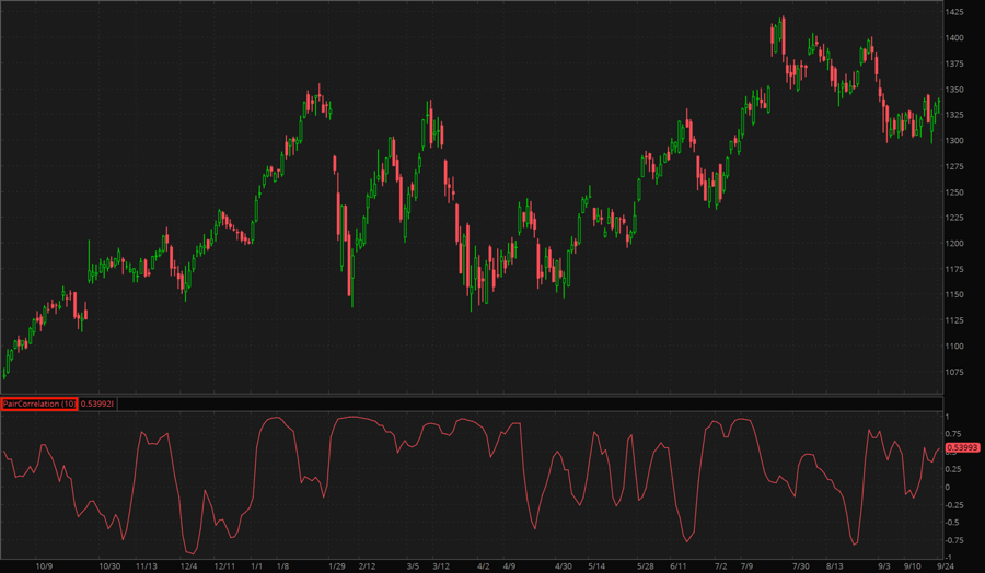 The Pair Correlation study calculates the Correlation coefficient between the prices of the instruments in the composite symbol (e.g., "IBM+GOOG").