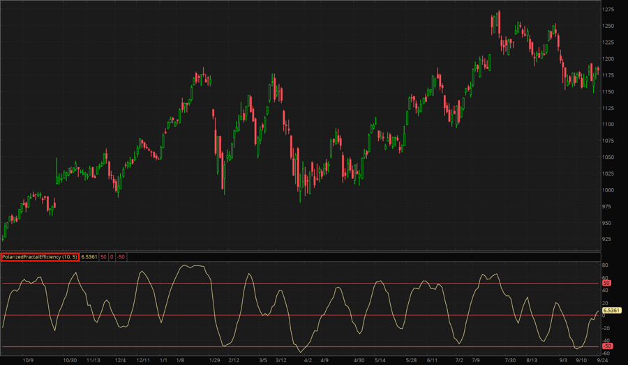 The Polarized Fractal Efficiency (PFE) indicator draws on Mandelbrot and fractal geometry to illustrate the efficiency of how pricing moves between two points over time. The more linear and efficient the price movement, the shorter the distance the prices must travel.
