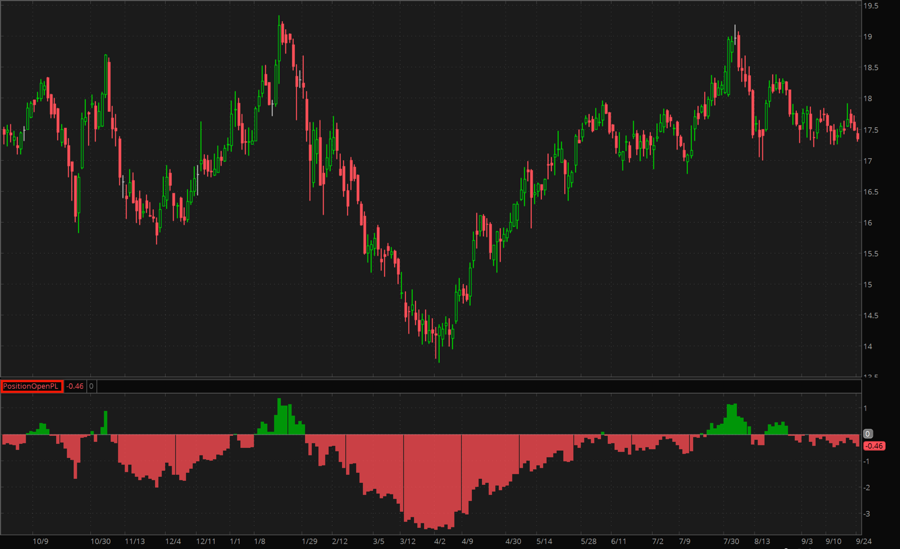 PositionOpenPL is a study that plots the Open Profit/Loss value for the currently selected account, based on the positions open on the currently selected symbol. This value is the difference between a position’s net liquidation value and either execution price or cost basis times the position size. Cost basis values are provided by Schwab and include the effects of commissions and tax elections. By default, the value is returned based on the execution price, however you can change it in the study input parameters.