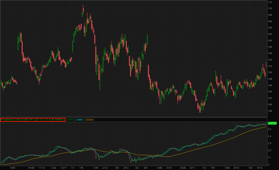 In addition to its main plot, the study also displays two moving averages of the ratio: a fast and a slow one. By default, these are simple moving averages that have lengths of 4 and 40 bars, correspondingly. The type and the lengths of the averages can be customized, however, the length of the fast average cannot be greater than that of the slow one.