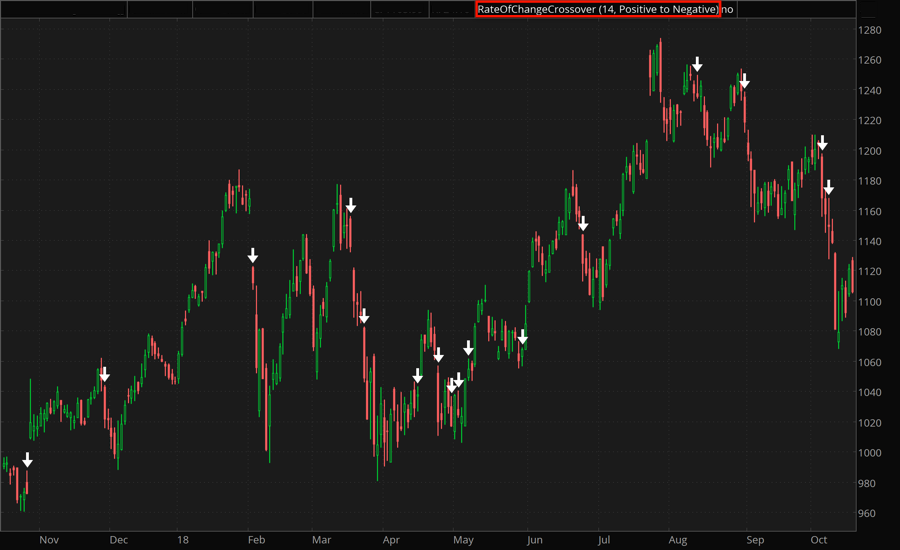 The Rate Of Change Crossover study is a technical indicator which finds where Rate Of Change crosses zero level.