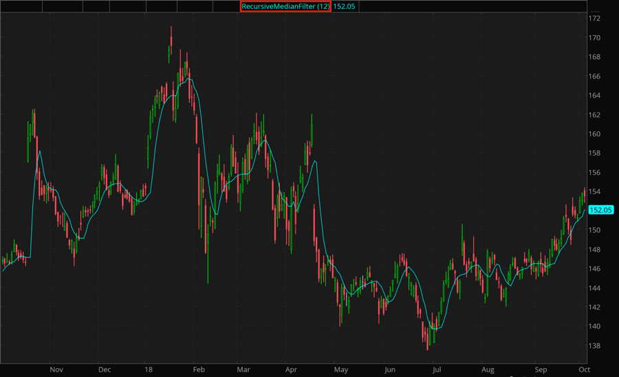 Essentialy, the Recursive Median Filter is the exponential moving average of the median close price. The smoothing factor is calculated based on a trigonometrical formula that uses the critical period of the filter as the argument.