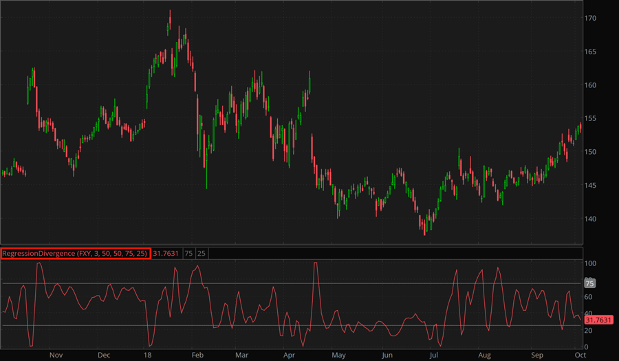 The Regression Divergence study is a correlation analysis technique proposed by Markos Katsanos. This indicator uses linear regression of the rate of change of two symbols to statistically forecast a price and then subtracts the actual price from it. The results are normalized on the scale from zero to 100.