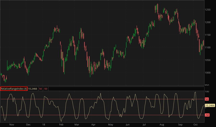 Plotted on the -100 to +100 scale, the Relative Range Index is a momentum oscillator which defines overbought/oversold conditions by measuring relationship of sum of "strong" price range changes and all price range changes having occured on the specified time period. It is considered a bearish signal when the oscillator surpasses the +60 (overbought) level and falls below afterwards; bullish signal, when it falls below the -60 (oversold) level with consequent rising above.