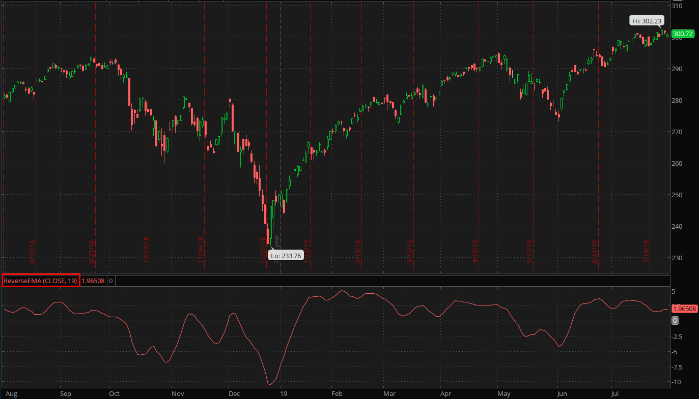 Reverse EMA can be used when analyzing trends and cycle components of price data. Normally, trends are analyzed on longer periods while market cycles are analyzed on shorter ones.