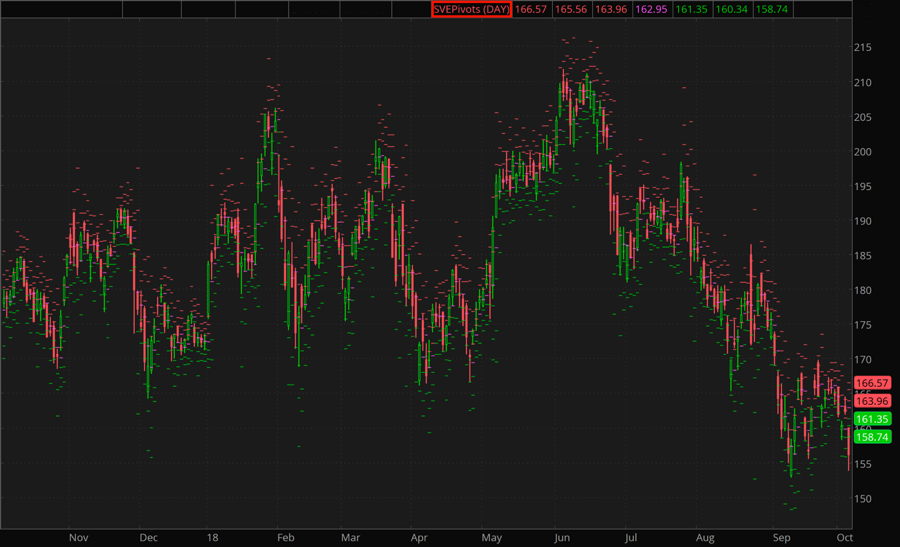 The SVEPivots study is a support/resistance technical indicator developed by Sylvain Vervoort that is based upon the observation that uptrend and downtrend price swings are quite often of almost equal lengths. The indicator estimates future price targets by calculating the measured move (price projection based on the previous swing). By default, the SVEPivots indicator calculates daily pivot levels, however, these can be calculated on any standard aggregation period. The daily pivot levels are defined by price values of the previous day, namely, high, low, and close. Using these values, the study projects seven intraday price targets: three support levels, three resistance levels, and a pivot point level.