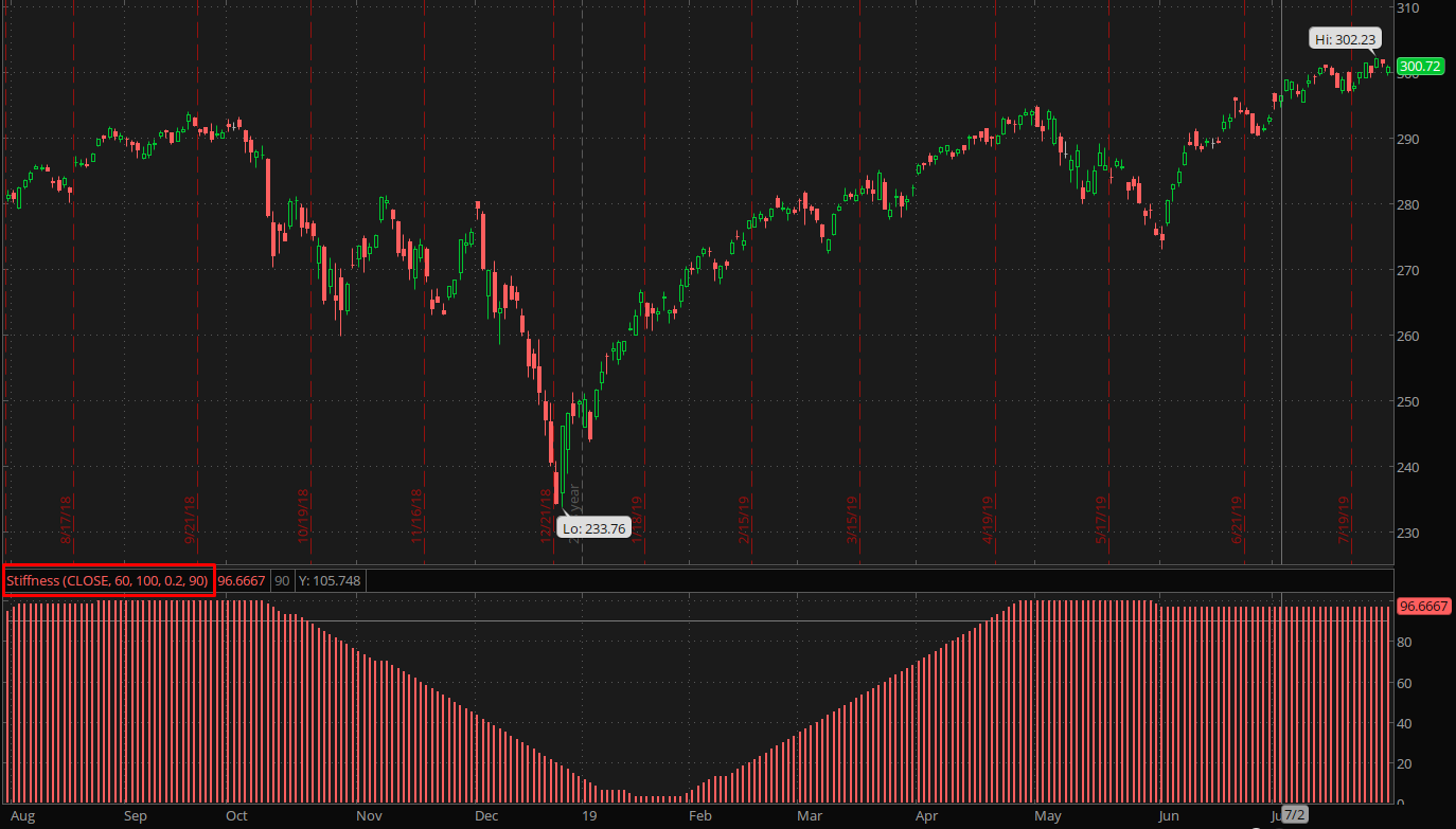 Stiffness is a technical indicator introduced by Markos Katsanos. This indicator helps assess the stiffness (i.e., the quality) of an uptrend. Based on the observation that in strong long-lasting uptrends, price seldom penetrates the 100-bar simple moving average, this indicator might help estimate how strong the current trend is by calculating the stiffness coefficient.