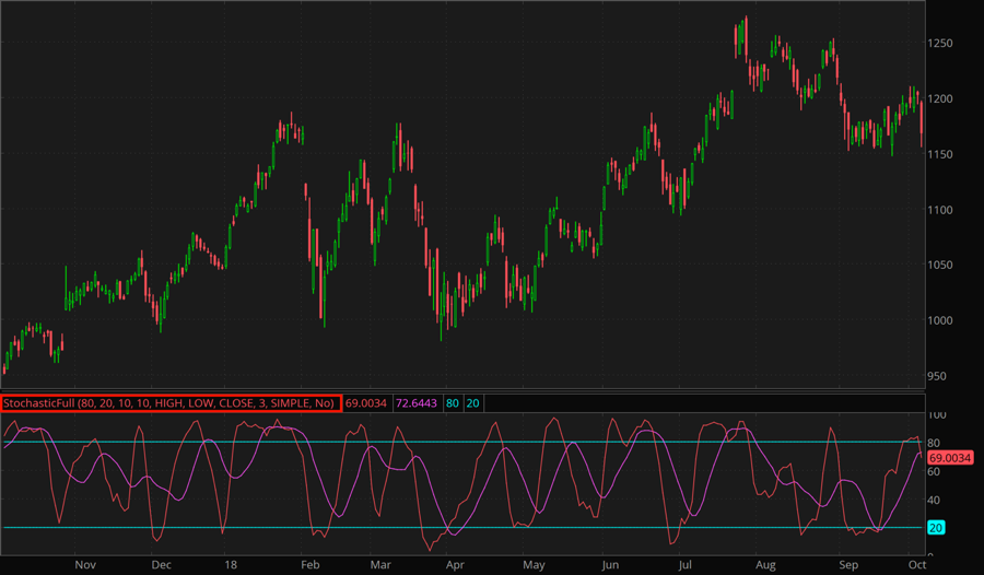 The Stochastic Full oscillator may thus act as both the Stochastic Fast and the Stochastic Slow. Setting the slowing period to 1 will eliminate the slowing effect of the first moving average, thus making the formula identical to that of the FastK. Setting the period to 3 will transform the oscillator into the Stochastic Slow. You can also use any custom slowing period.