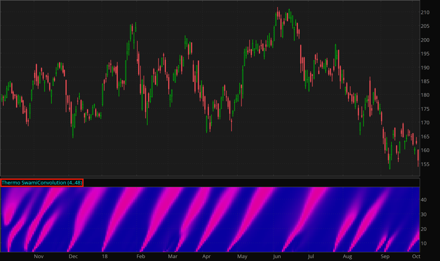 In default color scheme, the turnover points are indicated as purple streaks against deep blue background, i.e., at areas where the study has highest values. Swami Convolution is based on the eponymous digital signal processing technique which is a mathematical operation on two functions; the result of the operation is area overlap between the two functions as one is shifted against the other. In Swami Convolution, this technique is performed on two time series: direct and inverse, both considered as time functions. The main principle of the study is finding areas where the two functions become highly correlated thus signifying turnover points.