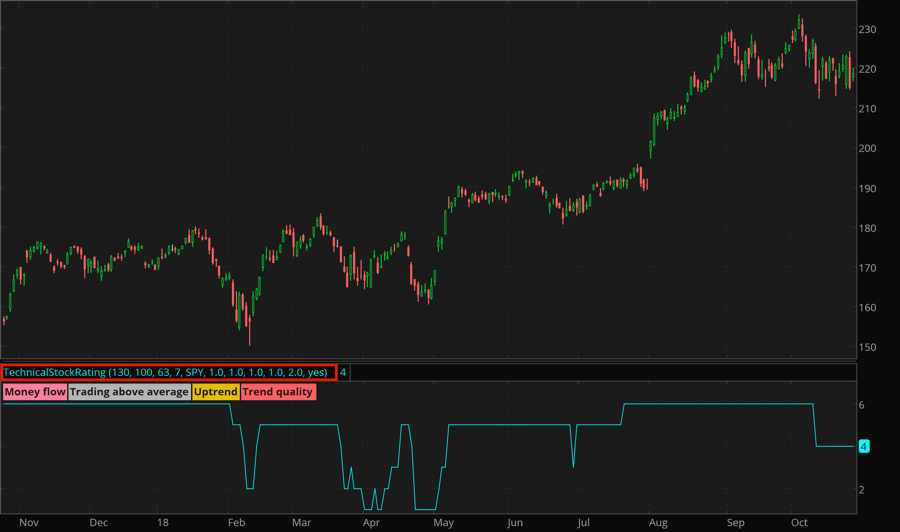 The Technical Stock Rating study is a rating system developed by Markos Katsanos. When applied to a stock symbol, the system evaluates its performance based on five technical analysis criteria. The stock is then assigned a rating based on how many criteria it satisfies. For greater flexibility, the study also uses a system of weights as optimization may be required for some symbols.