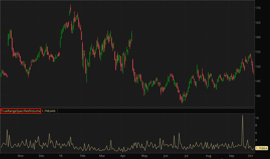 The True Range Specified Volume study is a resistance indicator. It is calculated as volume divided by TrueRange.