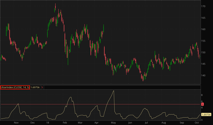 The Ulcer Index study plots values of Ulcer function. For your convenience, the main plot is complemented with safe level: when Ulcer Index goes beyond this level, an asset might be considered risky.