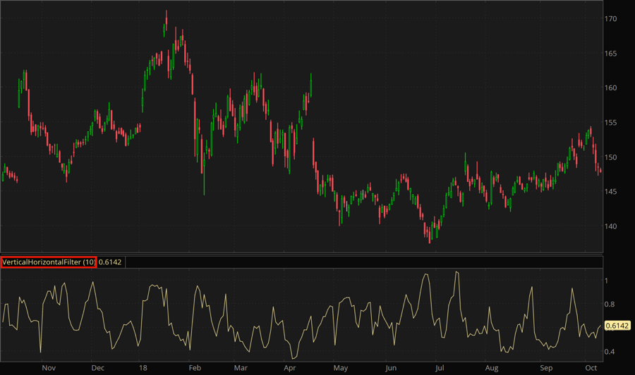 The Vertical Horizontal Filter calculates the difference between the highest high and the lowest low during a specified time period. This difference is then divided by the sum of daily close changes over the same period.