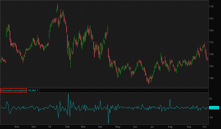 The Volume Accumulation study calculates volume multiplied by the difference between the close price and the midpoint of the bar's range.