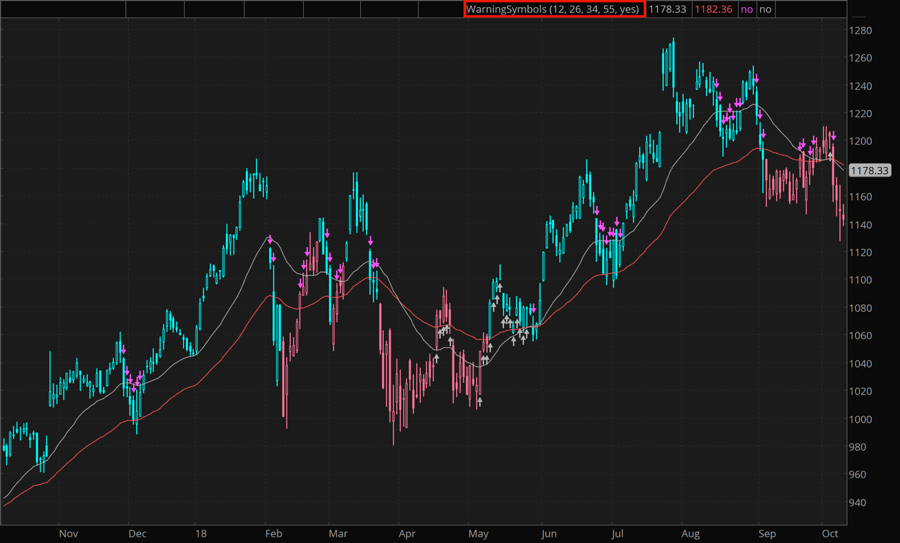 The Warning Symbols study is a technical indicator developed by Barbara Star. Based on the well-known MACD, it focuses specifically on its trending and momentum properties. In Warning Symbols, MACD is analyzed in relation to the zero level, which produces important trading signals. In addition to MACD analysis, this indicator displays “warning” signals (hence the name) based on the behavior of the price plot in relation to moving averages.