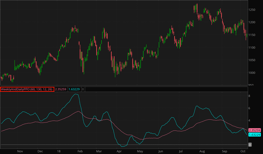Potential trading signals may be found at crossovers of the relative daily PPO line with either of the other PPO lines or crossovers of the PPO lines with the zero level. Looking for divergences of the daily, weekly, or relative PPO from the price plot may also prove useful.